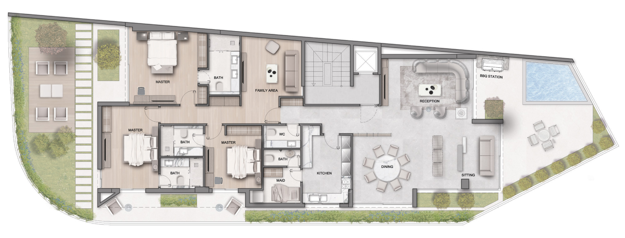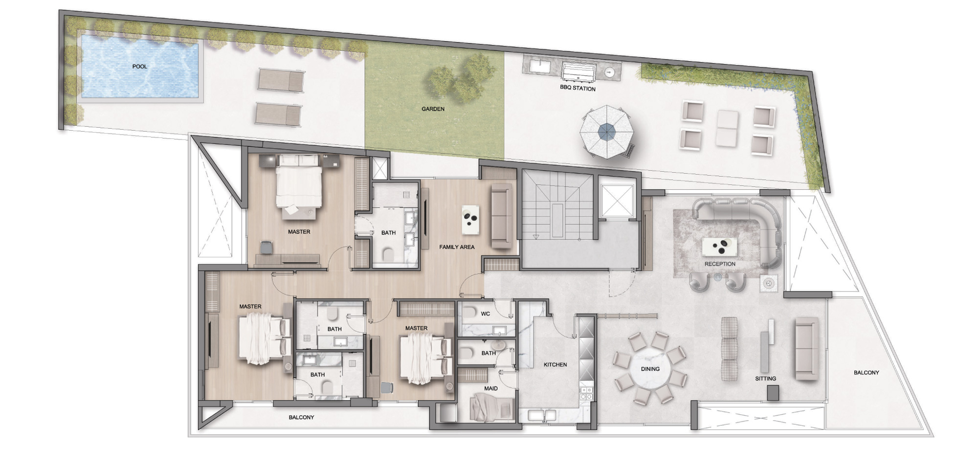 3 Bedrooms, spacious reception, cozy family room, maid room, green terrace & balcony, and a private pool.