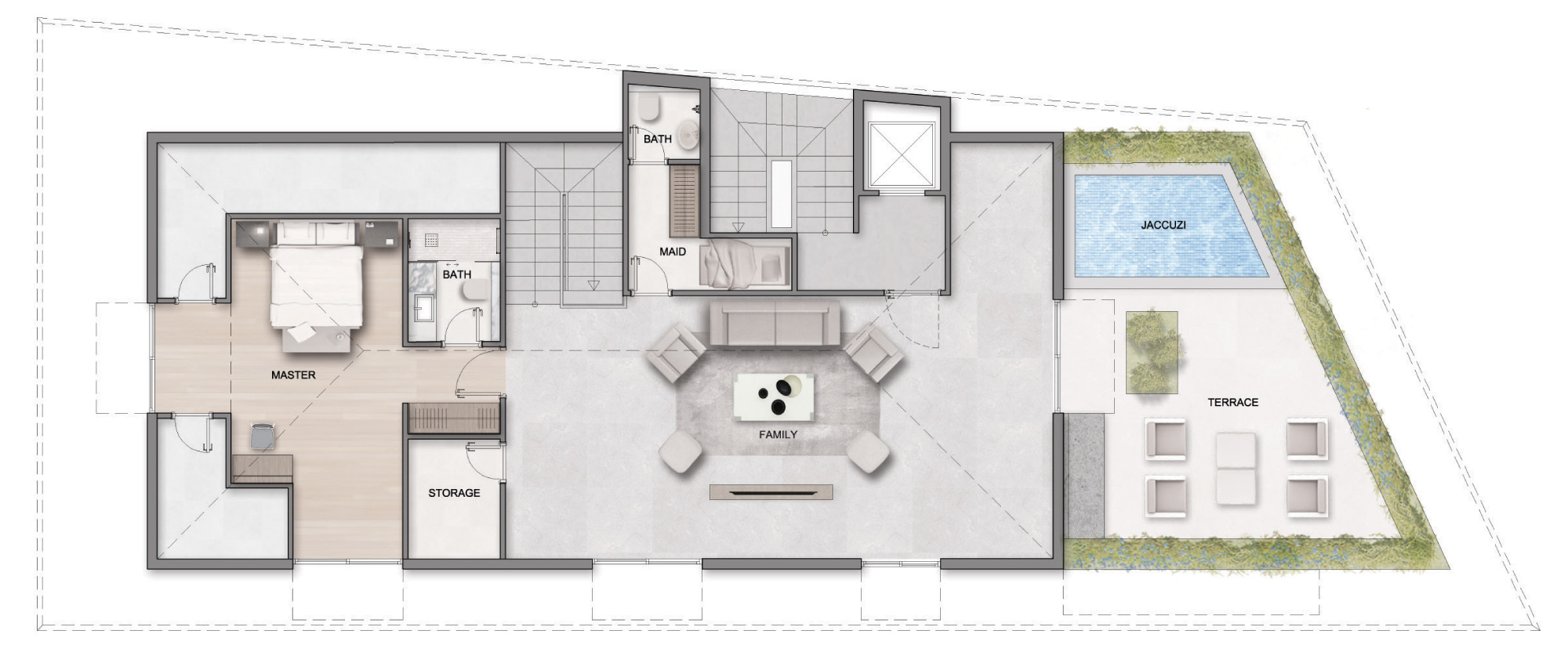 4 Bedrooms, spacious reception, grand family room, maid room, green terrace & balconies, and a jacuzzi pool.