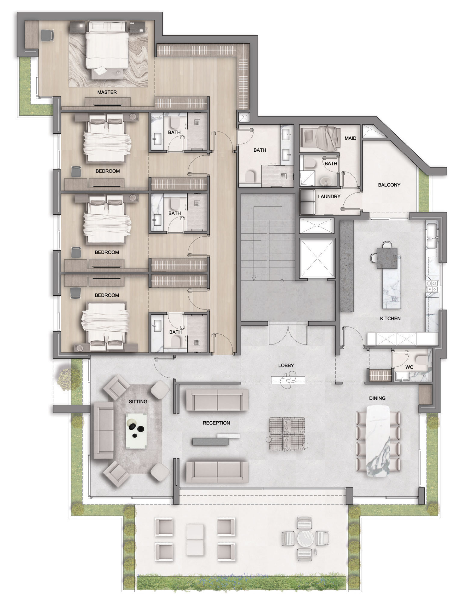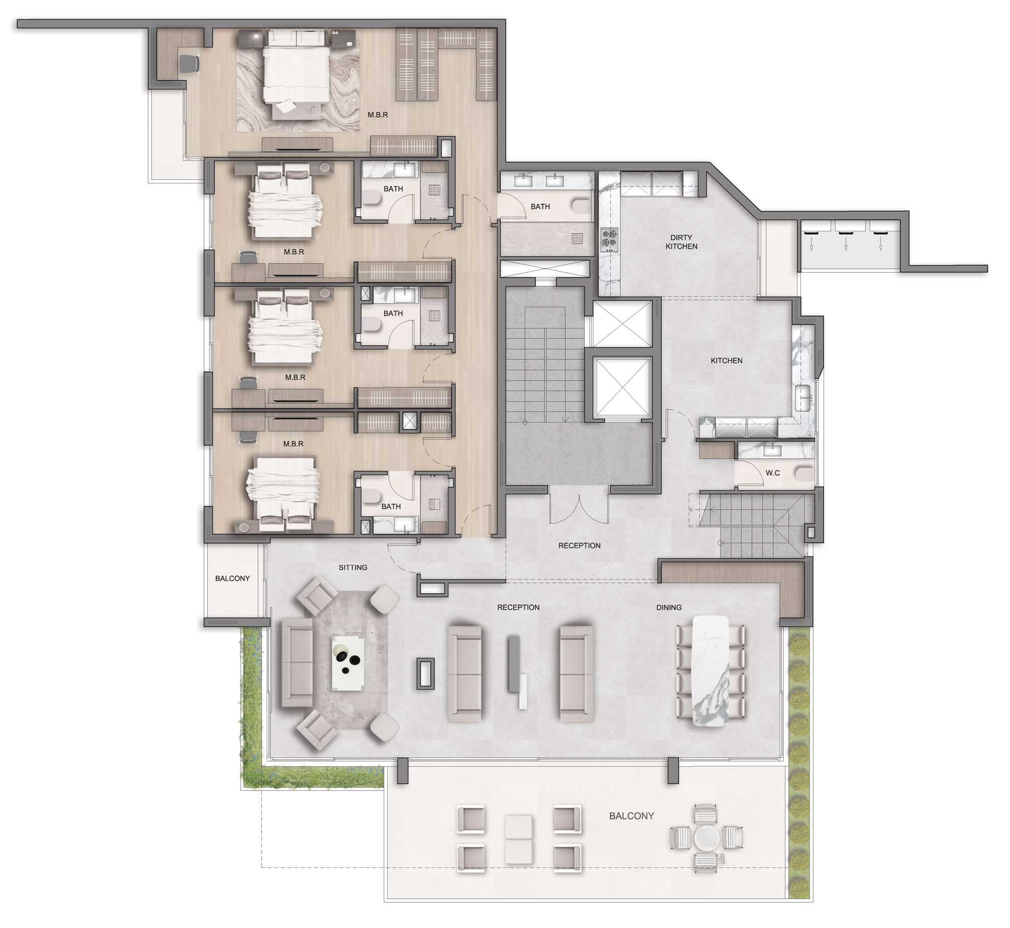 4 Bedrooms, spacious reception, maid room, separate dirty kitchen, gaming area, in unit storage room, green terraces & balcony.