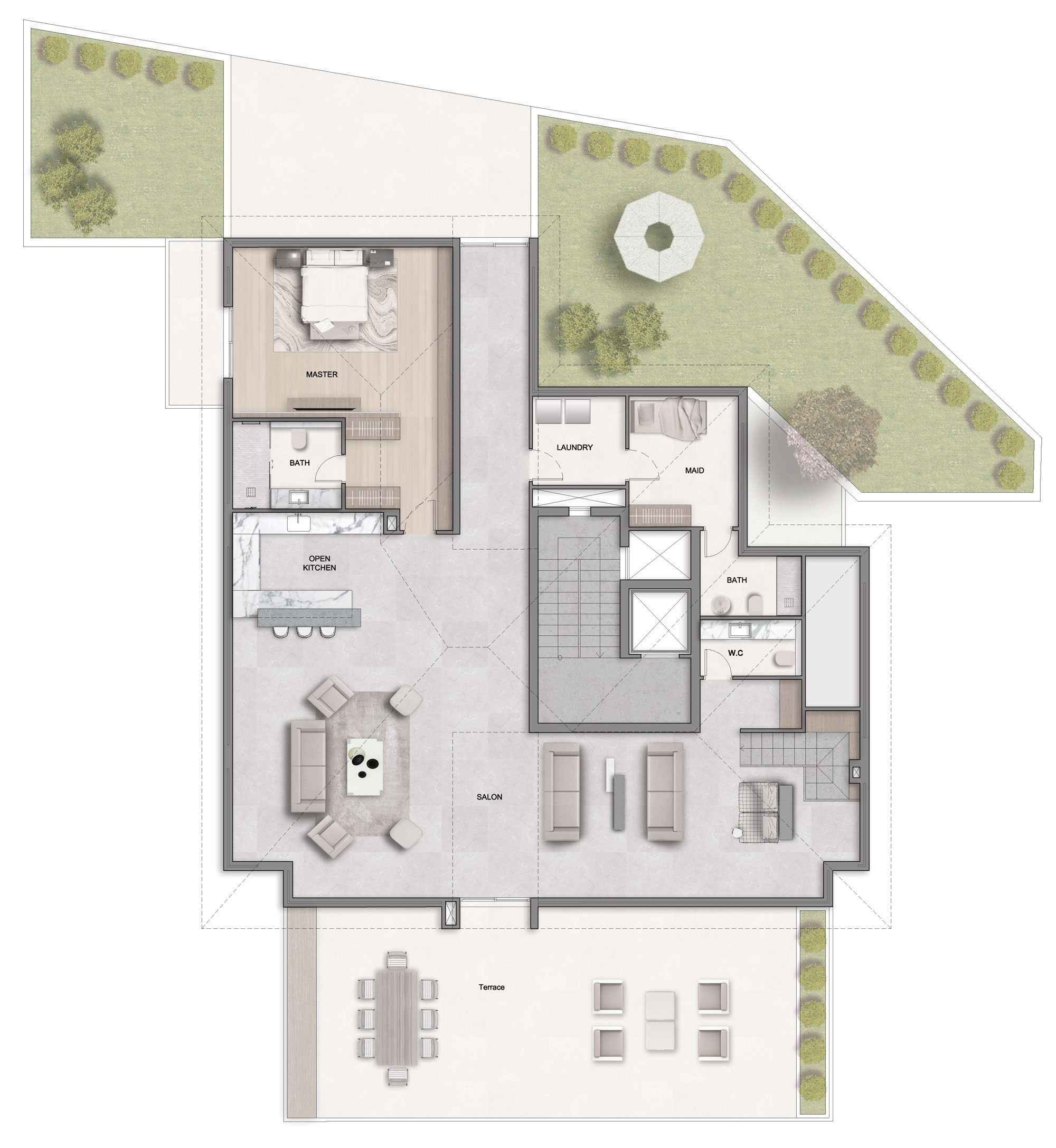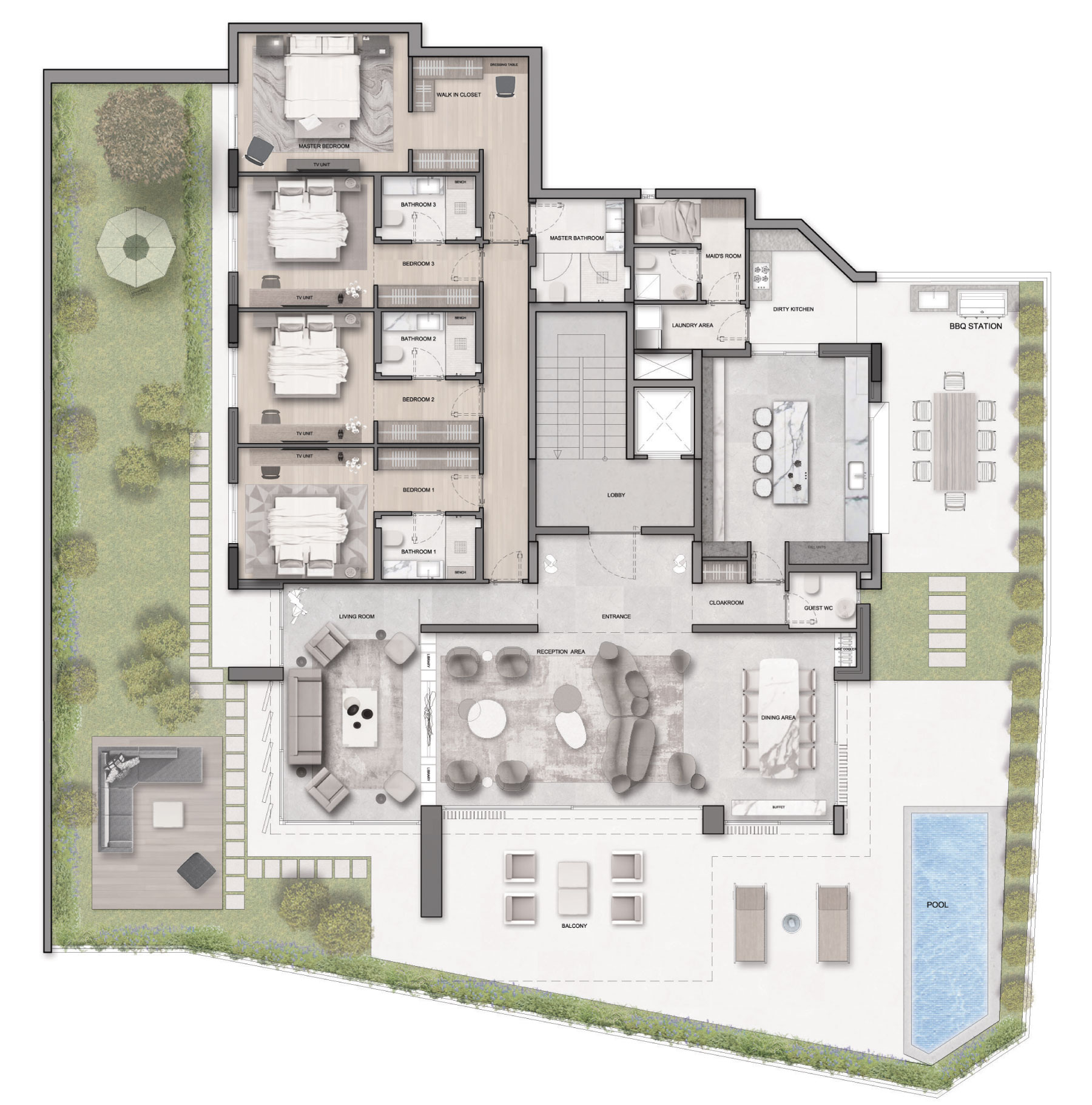 4 Bedrooms, spacious reception, maid room, laundry room, green terraces, and a private pool.