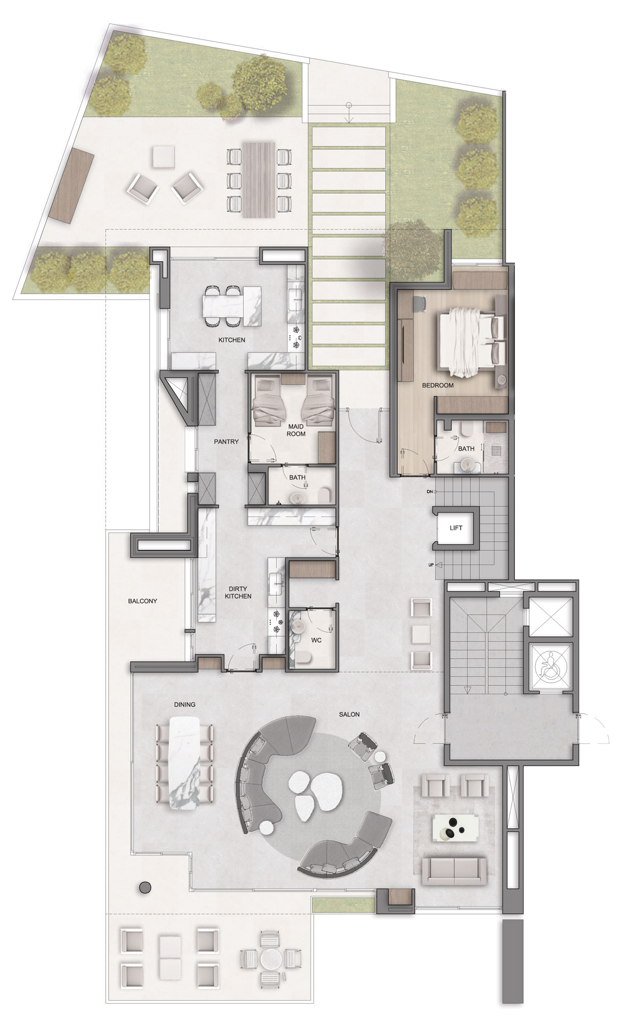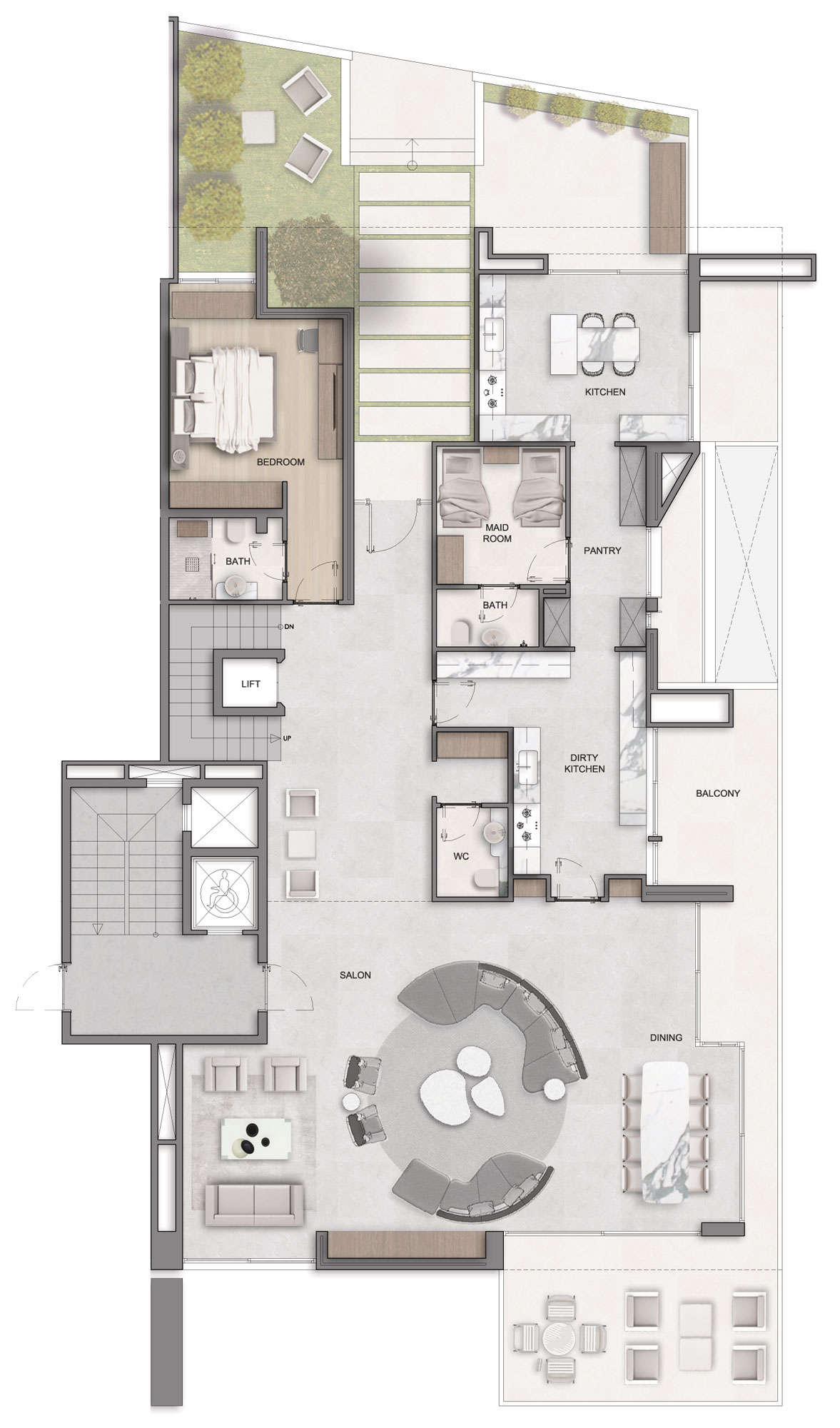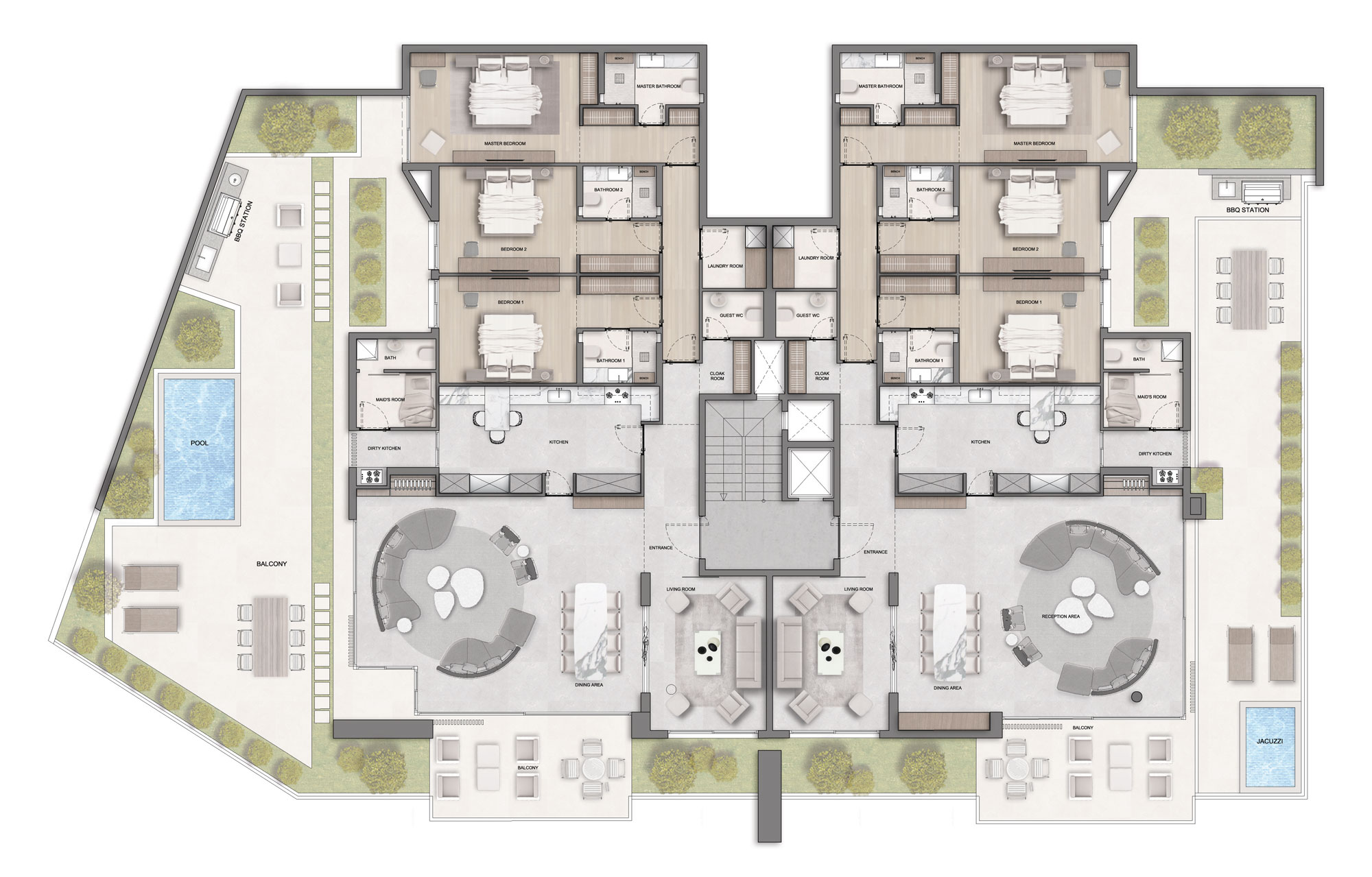 3 Bedrooms, spacious reception, maid room, laundry room, green terraces, and a private pool.
