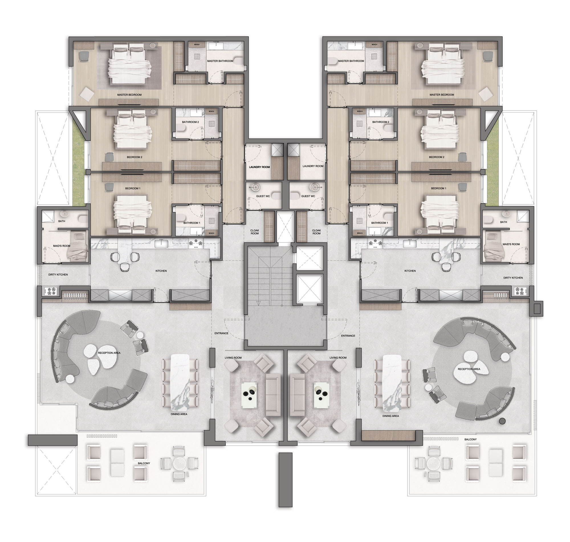 3 Bedrooms, spacious reception, maid room, laundry room, and green balconies.
